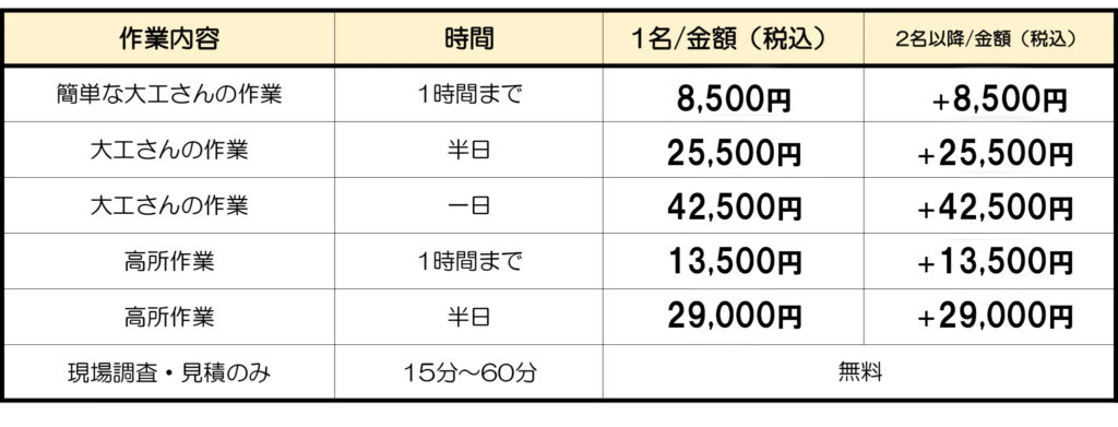 ※時間/価格はあくまで目安です。現場確認時に大枠のお時間・費用をお伝えします。(見積が必要な場合は後日送付)