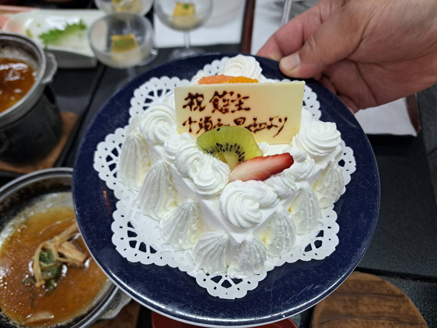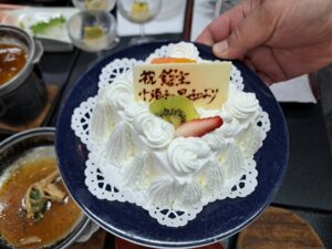 なんと、夕食時にサプライズケーキをご用意して頂きました。