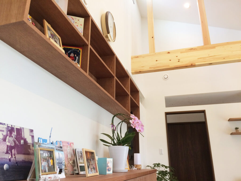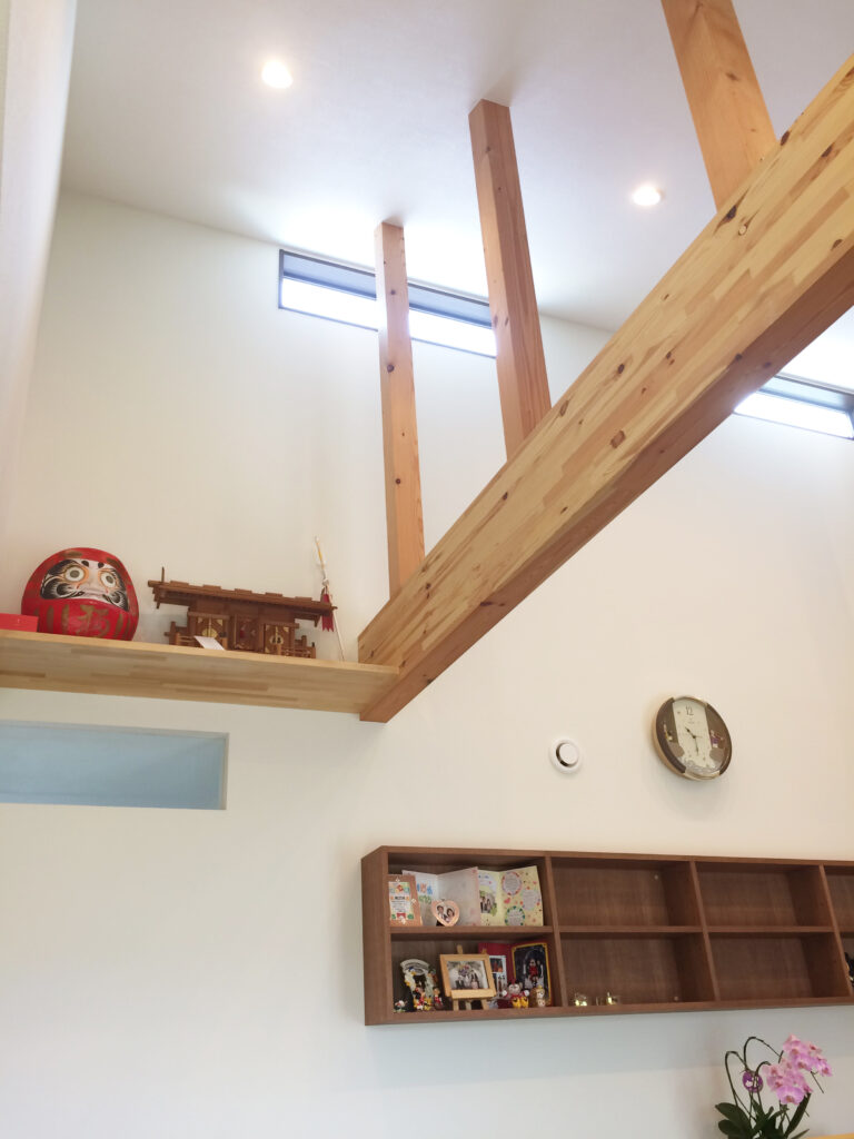 :そう、ちょっと気になるのよね(笑)。あと、室内の物干しも良かったでしょ。で、みんなが来ると「この梁がいいでしょ~」って、自慢しちゃうの、(笑)。あと、フローリングの無垢。それとデッキの手摺も助かってます。神棚の位置もちょっと高いですけど、いいところに収まっています。あと外壁も一生懸命選んだ甲斐あったなって・・・。